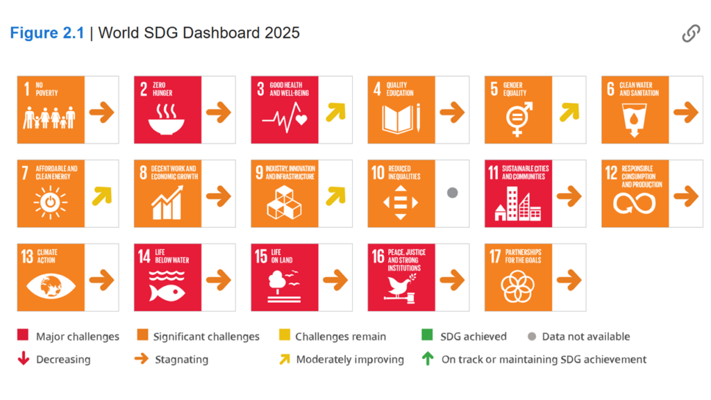 Kestävän kehityksen tavoitteiden toteutumista arvioidaan säännöllisesti. Alla olevassa kuvassa on tiivistetty tavoitteiden globaali tilanne vuonna 2025 julkaistun raportin mukaan. Lisätietoa arvioinnista löydät Sustainable Development Reportin verkkosivustolta. Sivustolta löytyy myös tarkkaa maakohtaista tietoa tavoitteiden toteutumisesta.