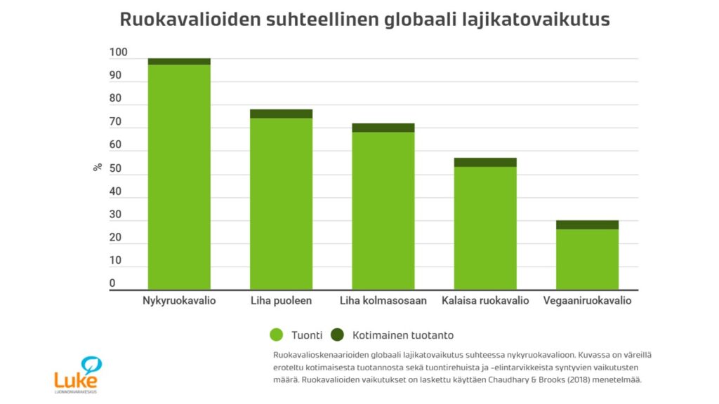 - Kuinka suuri kotimaisen tuotannon vaikutus globaaliin lajikatoon on verrattuna tuontiruoan vaikutukseen?