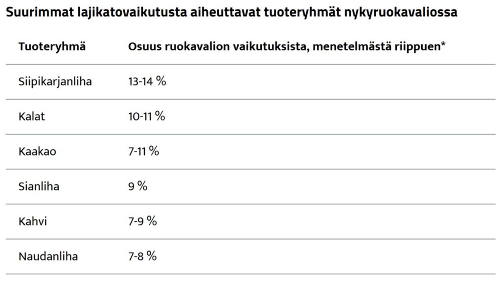 Lisäksi eri tuotteilla on erilaiset ympäristövaikutukset: toisilla suuremmat ja toisilla pienemmät. Naudanlihakilon tuottamisen päästökerroin, maankäytön kerroin ja vesijalanjälki ovat huomattavasti suuremmat kuin härkäpapukilon, mutta sitä voi olla vaikeaa uskoa, sillä harva meistä pääsee maatilalle arvioimaan tuotannon vaikutuksia omilla aisteillaan. Esimerkiksi energian ohivirtausta tuotantoketjussa ei edes viljelijä itse voi nähdä.